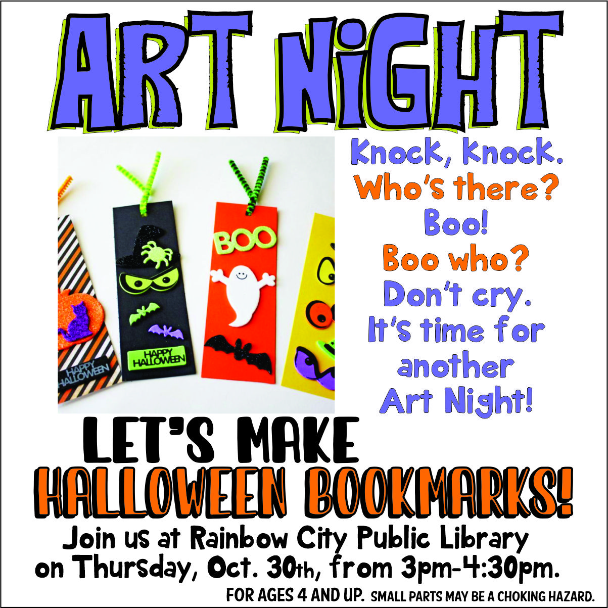Art Night Join us on Thursday, October from 3:00pm-4:30pm to make Halloween bookmarks! Ages 4 & up. + Add to Google Calendar + iCal / Outlook export 00 days 00 hours 00 minutes 00 seconds Date Oct 30 2025 Time 3:00 pm - 4:30 pm Location Rainbow City Public Library 3702 Rainbow Drive, Rainbow City, AL 35906 Category Library Organizer Rainbow City Public Library Phone 256-442-8477 Email rbclibrary@rbcalabama.org Website http://www.rbclibrary.org Share this event