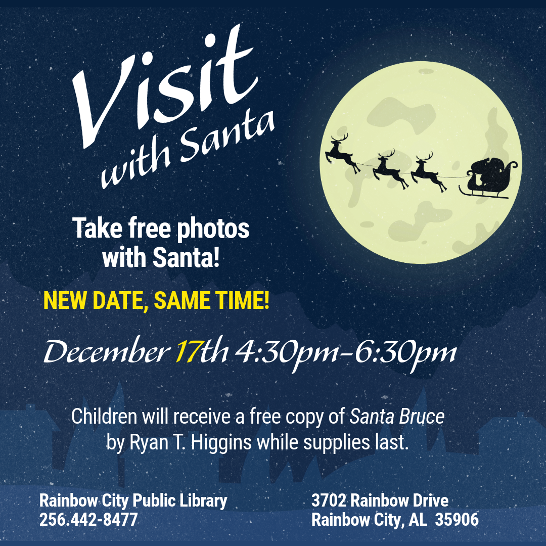 Santa plans to visit Rainbow City Public Library on Wednesday, December 17 (NEW DATE!) from 4:30-6:30pm! Bring your children by the library to visit with them and take your own photographs. Children will receive a free copy of Santa Bruce by Ryan T. Higgins while supplies last!